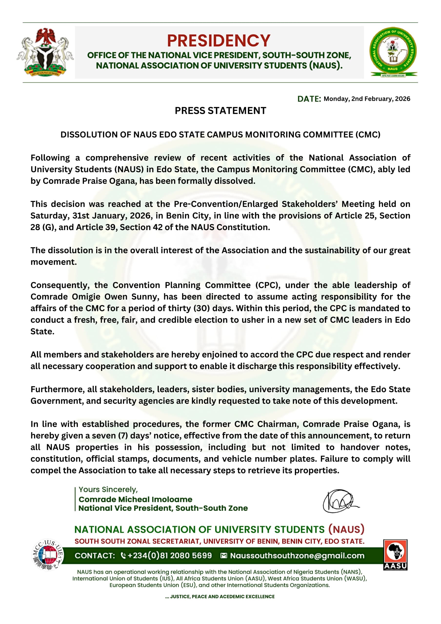 BREAKING: NAUS Dissolves Edo State Campus Monitoring Committee (CMC)