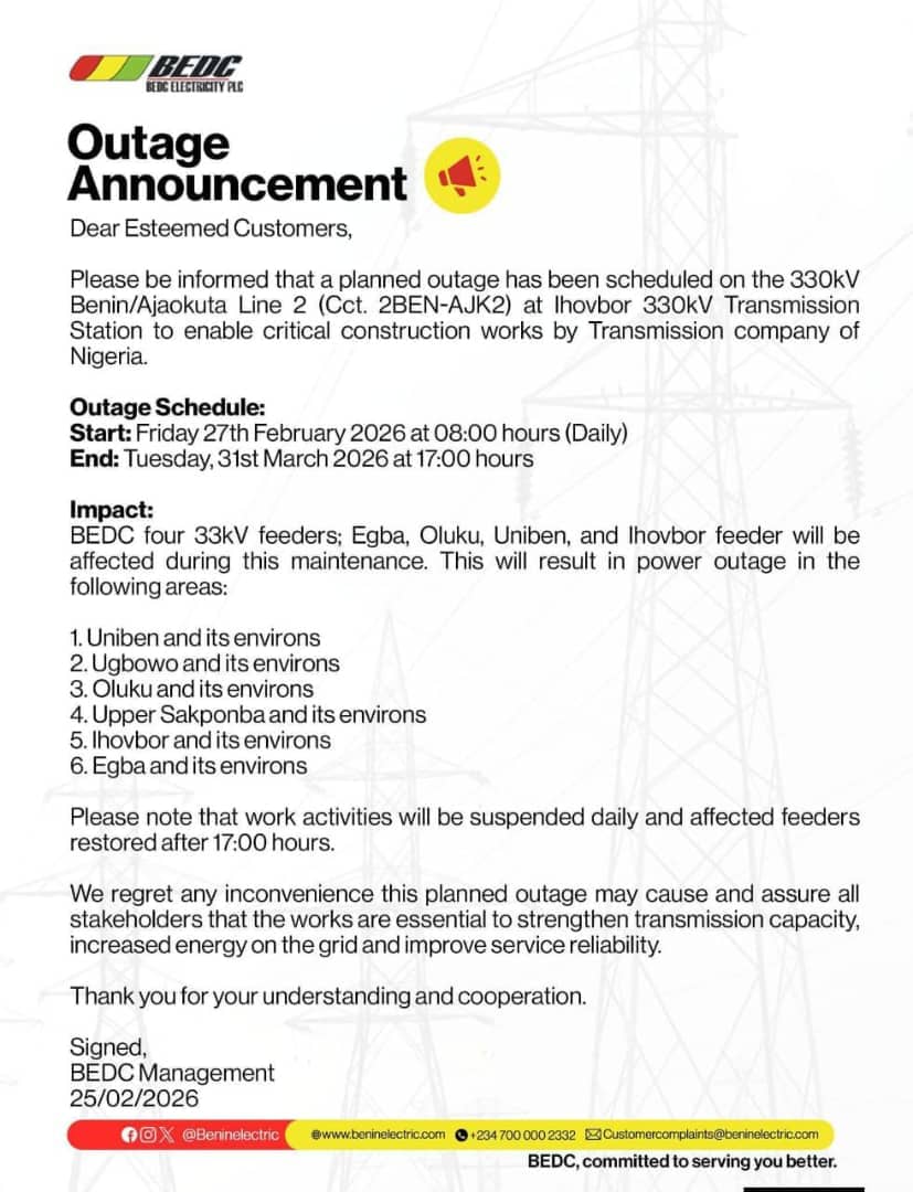 The Benin Electricity Distribution Company (BEDC), Edo State Chapter, on Tuesday, 25 February 2026, announced a scheduled power outage affecting parts of Benin City to facilitate critical maintenance works.