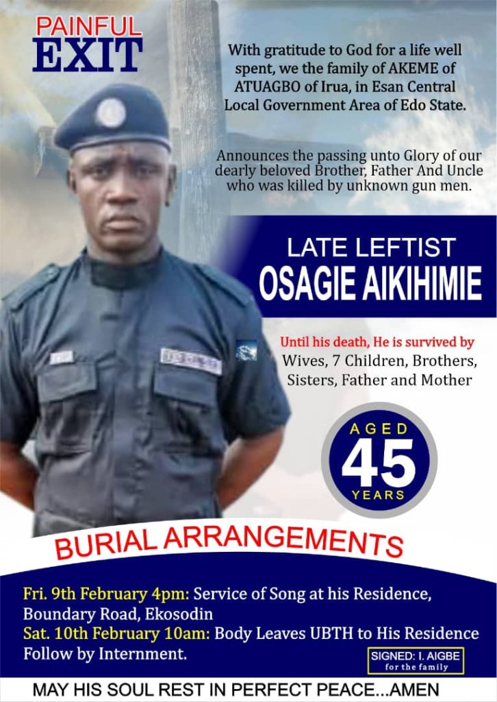 The Ekosodin Vigilante Network has issued a community announcement, declaring a curfew effective from 9 pm on Friday, February 9, 2024, until 2 pm on Saturday, February 10, 2024. This curfew is prompted by the burial of the late Leftist Osagie Aikihimie, a 45-year-old resident who fell victim to unknown gunmen. The deceased is survived by his wives, seven children, brothers, sisters, father, and mother.