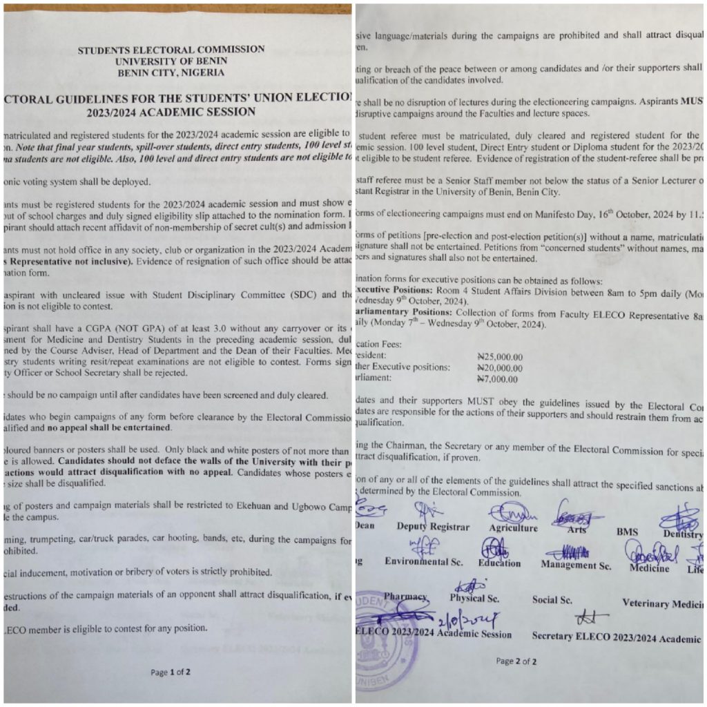 The Students’ Electoral Commission of the University of Benin has released the guidelines for the conduct of the Student Union elections for the 2023/2024 academic session. It can be recalled that Student Union activities on campus have been suspended since April due to an unfortunate incident that occurred at the University Staff Club in April 2024. After an investigation into the incident, the University Management deemed it necessary to suspend all Student Union activities indefinitely.