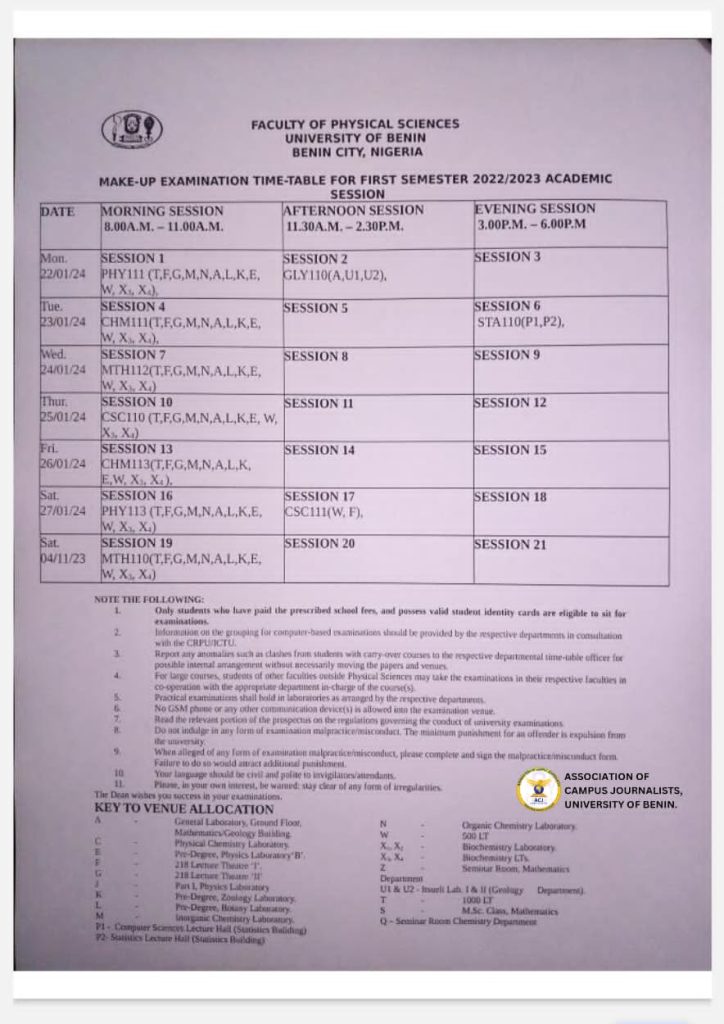 The Faculty of Physical Sciences is pleased to announce the release of the Make-Up Examination Timetable for the first semester of the 2022/2023 academic session. Scheduled to span from Monday, 22nd January 2024, to Saturday, 4th February 2024, this examination holds particular significance for carry-over students and those who, due to irregularities in the first semester calendar, missed the initial examination session.