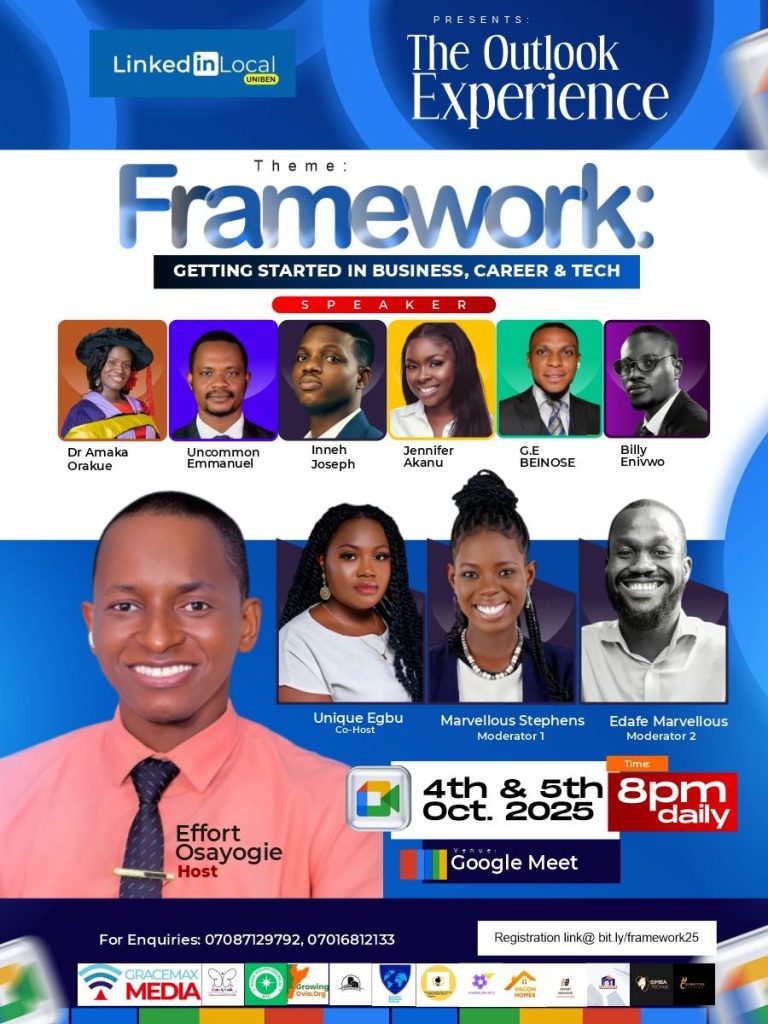 LinkedIn Local Uniben is set to host The Outlook Experience: Framework – Getting Started in Business, Career and Tech. This program will run for two days virtually and is designed to provide practical guidance and proven strategies for starting a successful business, career, or tech journey, and to gain momentum.
