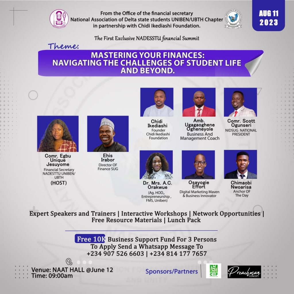 The National Association of Delta State Students (NADESSTU), UNIBEN/UBTH chapter, hosted their much-anticipated inaugural Exclusive Financial Summit at the NAAT Hall, University of Benin on Friday, 11 August, 2023. The event, which aimed to promote financial literacy and transform lives, proved to be a resounding success, attracting a diverse audience from various departments in UNIBEN, and beyond, with a notable participation from the department of Science and Laboratory Technology (SLT).