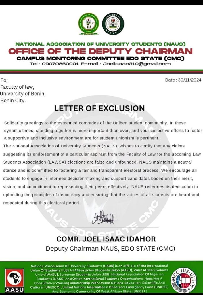 The National Association of University Students (NAUS) has clarified its position regarding the forthcoming elections of the Law Students Association (LAWSA) at the University of Benin. In a statement issued on 30 November 2024, Comrade Joel Isaac Idahor, Deputy Chairman of the Campus Monitoring Committee in Edo State, made it clear that NAUS has not endorsed any candidate.