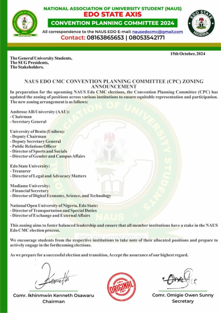 The zoning is expected to foster balanced leadership and provide all member institutions with a fair opportunity to contribute to the NAUS Edo CMC election process. Students from the respective institutions are encouraged to take note of their allocated positions and actively participate in the forthcoming elections.