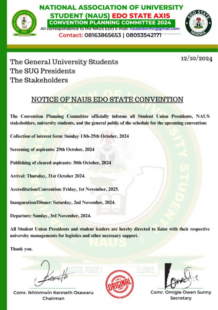 The National Association of University Students (NAUS), Edo State chapter, has officially announced the dates for its upcoming convention.