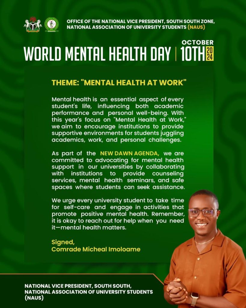 On 10th October, the world observes and celebrates World Mental Health Day, a global programme dedicated to raising awareness and promoting mental health education. The 2024 commemoration saw the Vice President of the National Association of University Students (NAUS), South South Zone, Comrade Michael Imoloame, addressing the mental health challenges faced by Nigerian university students.