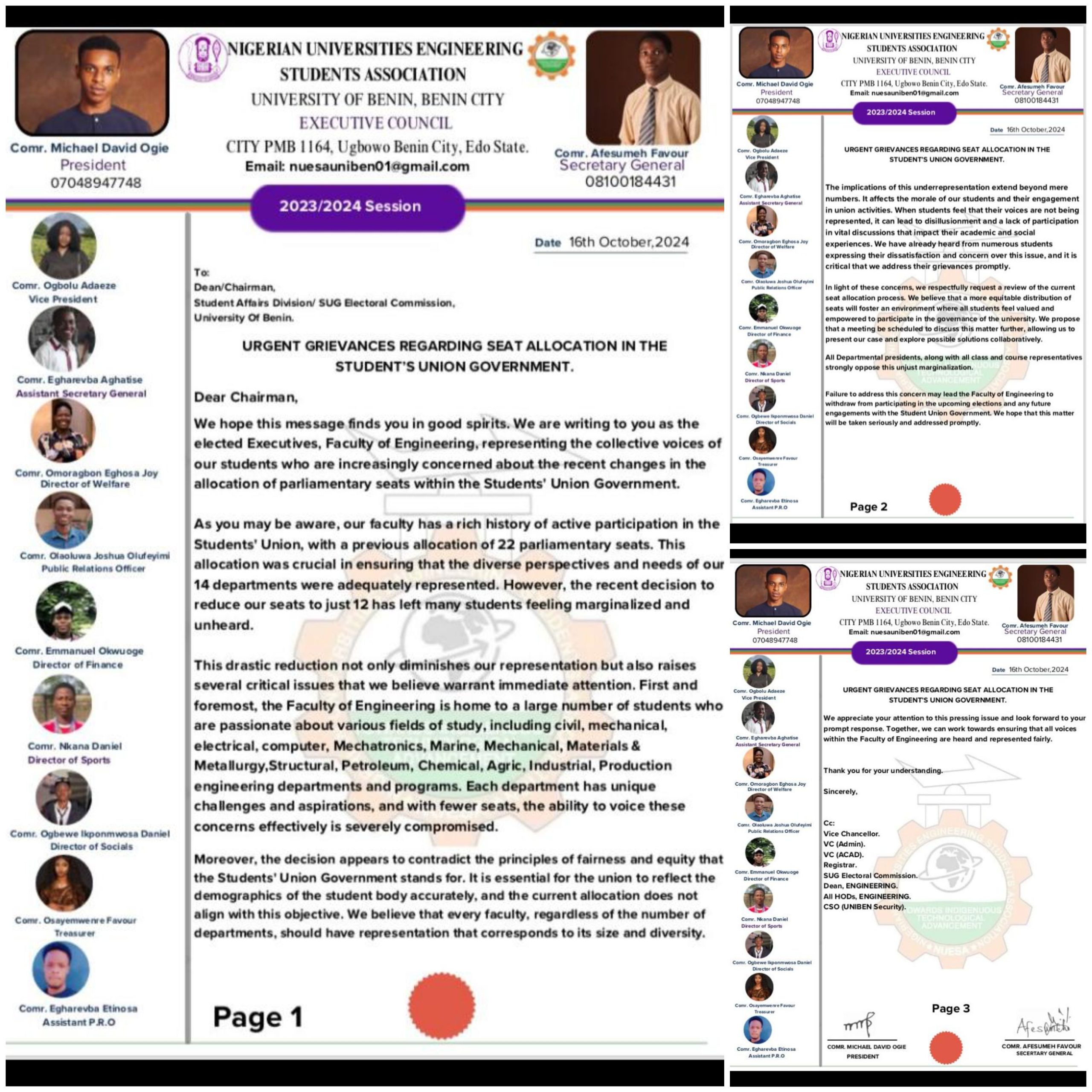 The Nigerian Universities Engineering Students Association (NUESA) UNIBEN chapter has expressed its urgent grievances concerning the underrepresented seat allocation for the faculty in the Student Union Government through an official letter to the chairman of the SUG Electoral Commission on the 16th of October, 2024.
