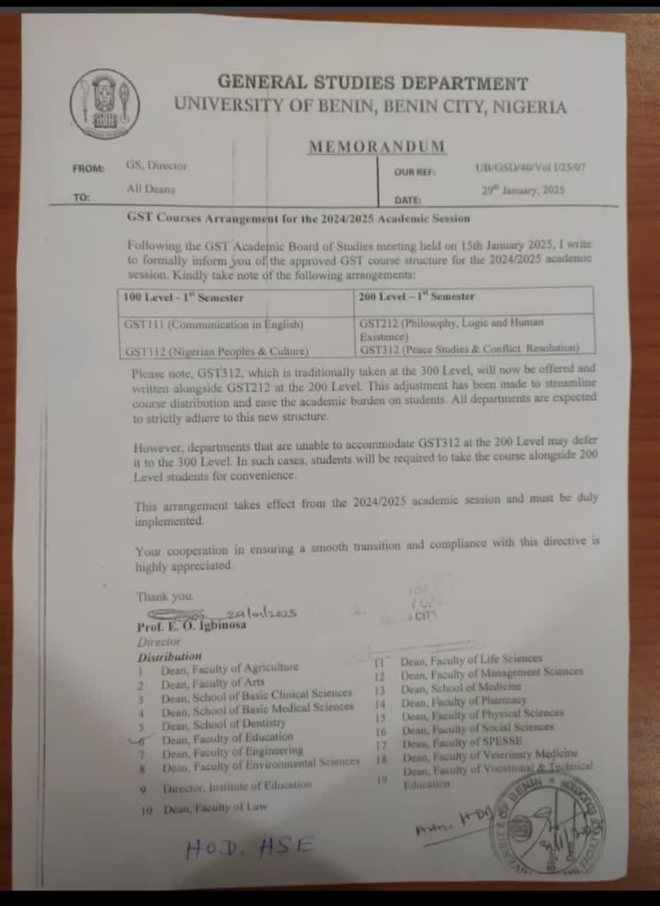 The University of Benin (uniben) has adjusted its GST course structure for the 2024/2025 Academic session