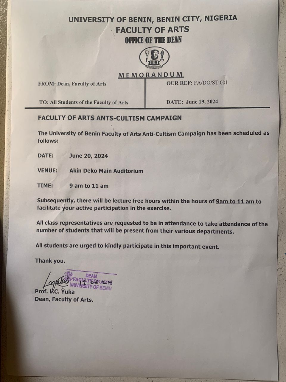 University OF Benin Announces Anti-Cultism Campaign Week.