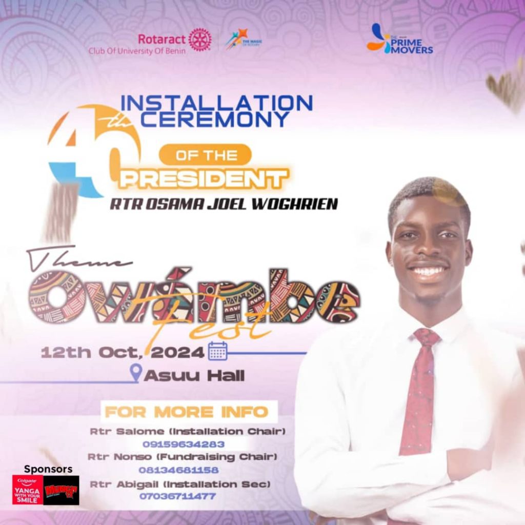 The Rotaract Club of the University of Benin today, 12th October 2024, held the installation ceremony of its 40th President, Rtr Osama Joel Woghiren. The event, tagged “Owambe Fest,” took place at ASUU Hall, Uniben, Ugbowo Campus. The ceremony was graced by distinguished personalities, reputable campus organisations, student union association leaders and representatives, as well as students of the University of Benin, friends, and well-wishers of the newly installed President.