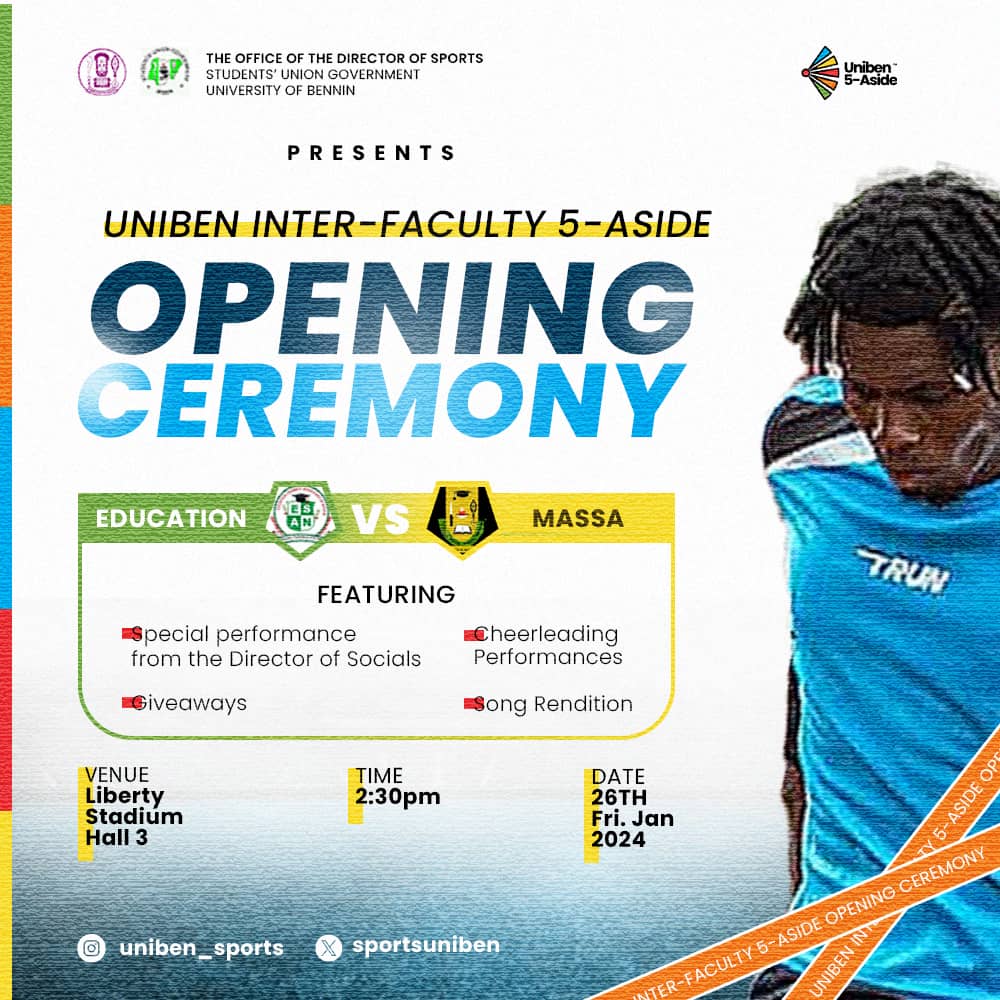 Get ready for an exciting event at UNIBEN! Join us for the Inter-Faculty 5-Aside tournament's Novelty Match Fixtures on 08/02/24. Witness thrilling clashes between UNIBEN Sports Media, Maverick Executives, and…