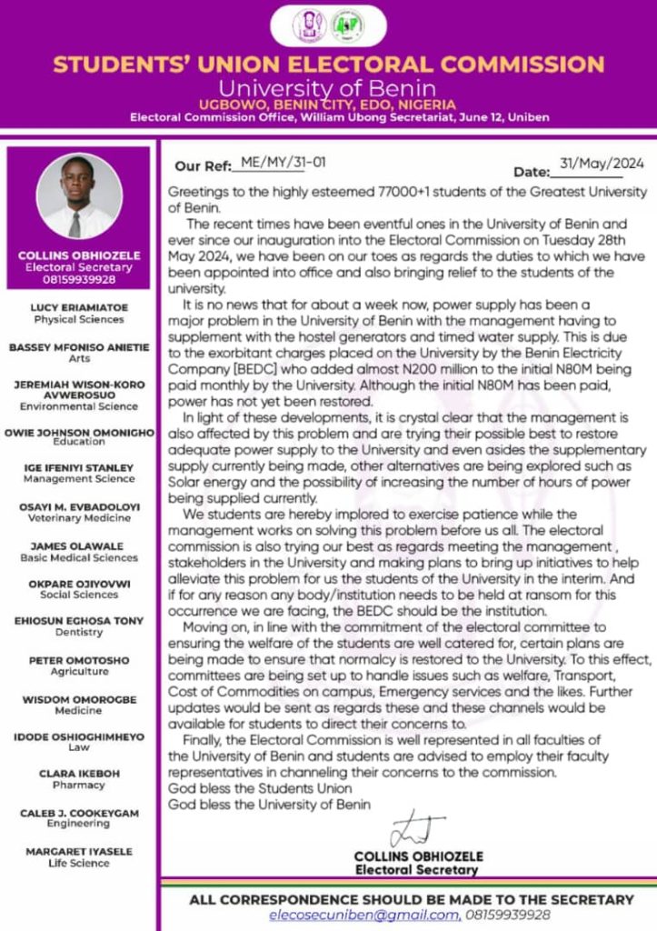In a memo released on Friday, 31st May, 2024, the University of Benin’s Students’ Union Electoral Commission addressed the ongoing power supply issues affecting the institution, urging students to “exercise patience while the management works on solving this problem before us all.”