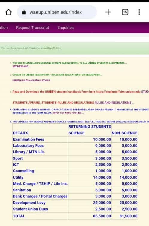 On the morning of Tuesday, September 19, 2023, a sudden wave of concern swept through the University of Benin community as news broke about a significant increase in school fees for students who had been admitted before the 2022/2023 academic year. This news sent shockwaves through the student body, prompting many to immediately check their Kofa page to verify the startling revelation.