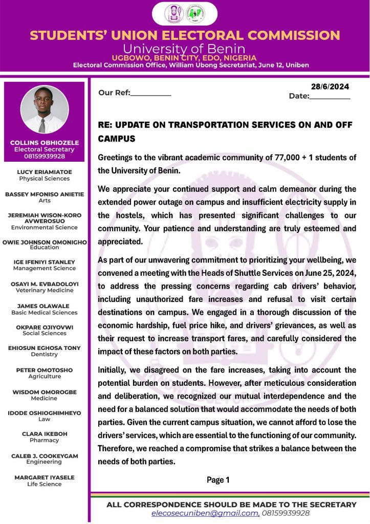 Contained in a memo signed by the Electoral Secretary, Collins Obhiozele, the Students’ Union Electoral Commission presented the adjustments to the fares for on and off-campus transportation services, which will take effect from 1st July 2024.