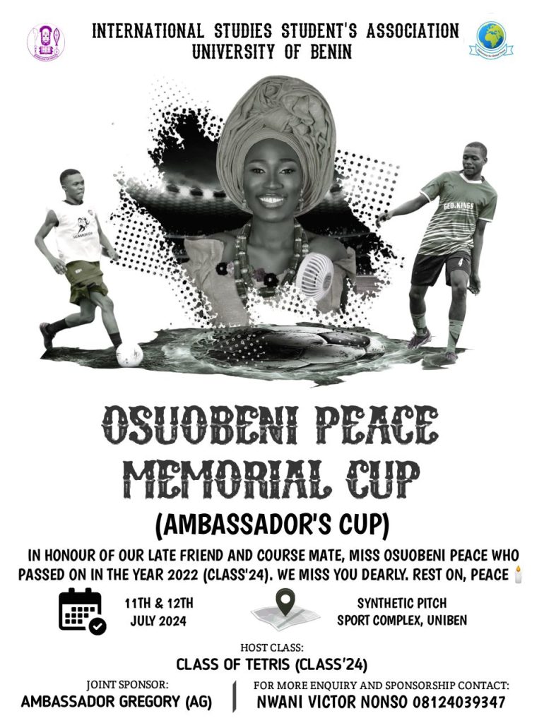 The International Studies Student Association announced on Saturday, 29th June, the upcoming Osuobeni Peace Memorial Cup (Ambassador’s Cup). The ISSA will be hosting the football tournament in honour of the late Miss Osuobeni Peace, who was a student of the Department of History and International Studies, University of Benin.