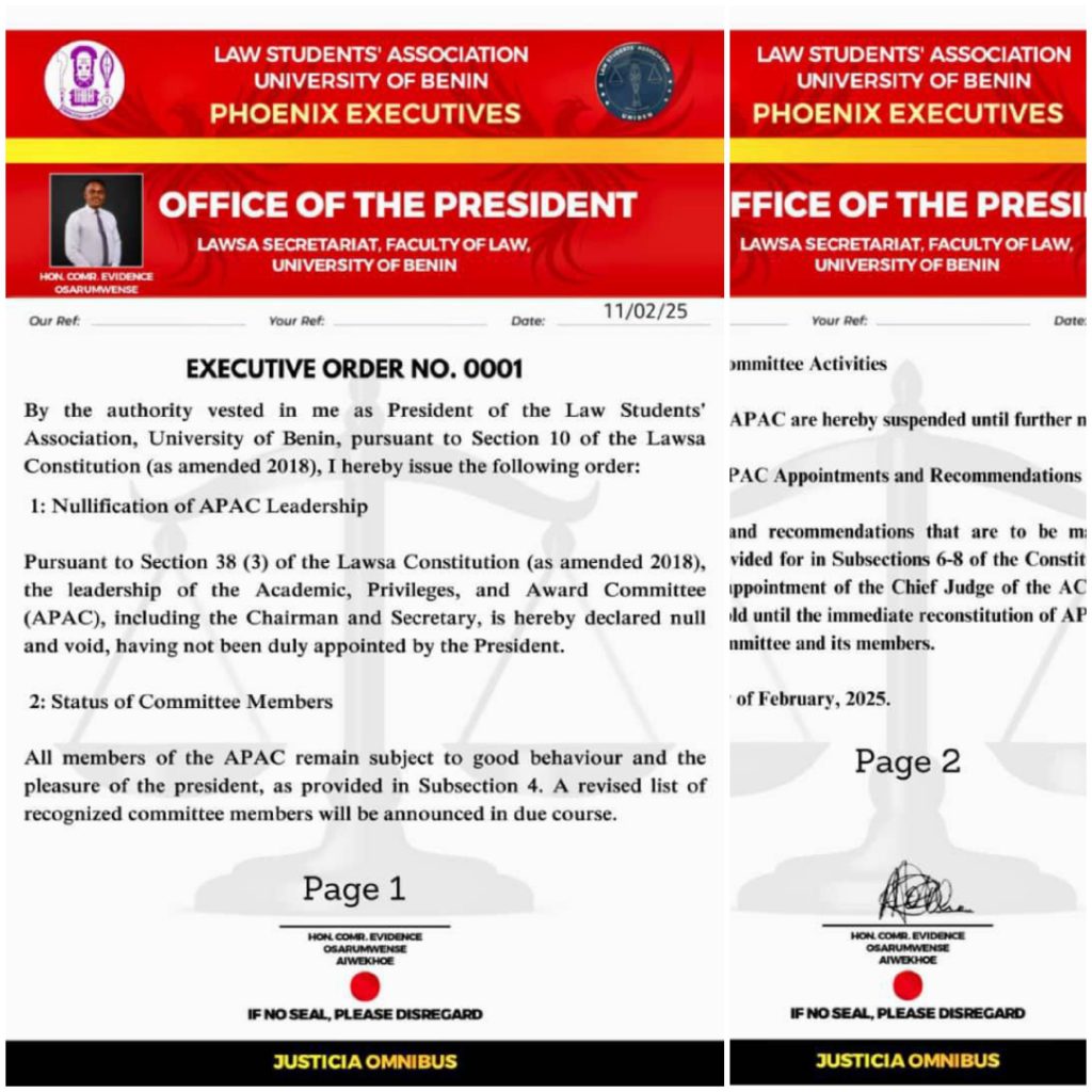The President of the Law Students’ Association (LAWSA), Comrade Evidence Osarumwese, has suspended the activities of the Academic, Privileges and Award Committee (APAC).