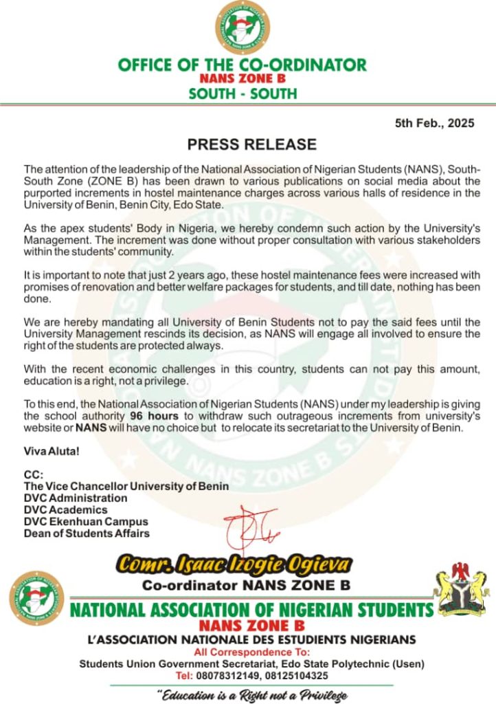 The leadership of the National Association of Nigerian Students, South-South Zone (NANS Zone B) has condemned the increments in the hostel maintenance charges for the 2024/2025 academic session in the University of Benin.