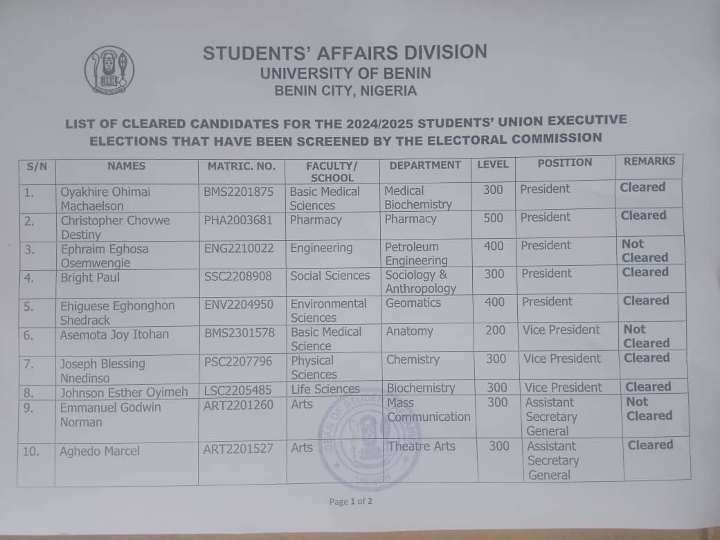 The Student’s Affairs Division of the University of Benin has officially released the list of candidates cleared as well as those who are yet to be cleared by the electoral commission to participate in the 2024/2025 students’ Union Government (SUG) Executive Elections.