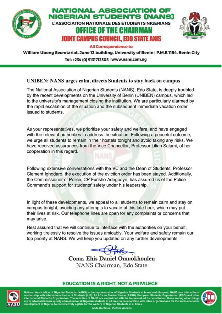 In a signed memo by the chairman of NANS, Comrade Ehis Daniel, he urged students to remain calm and stay back in their hostels, having received assurance from the Vice Chancellor, Prof. Lilian Salami, of her cooperation towards resolving the situation.