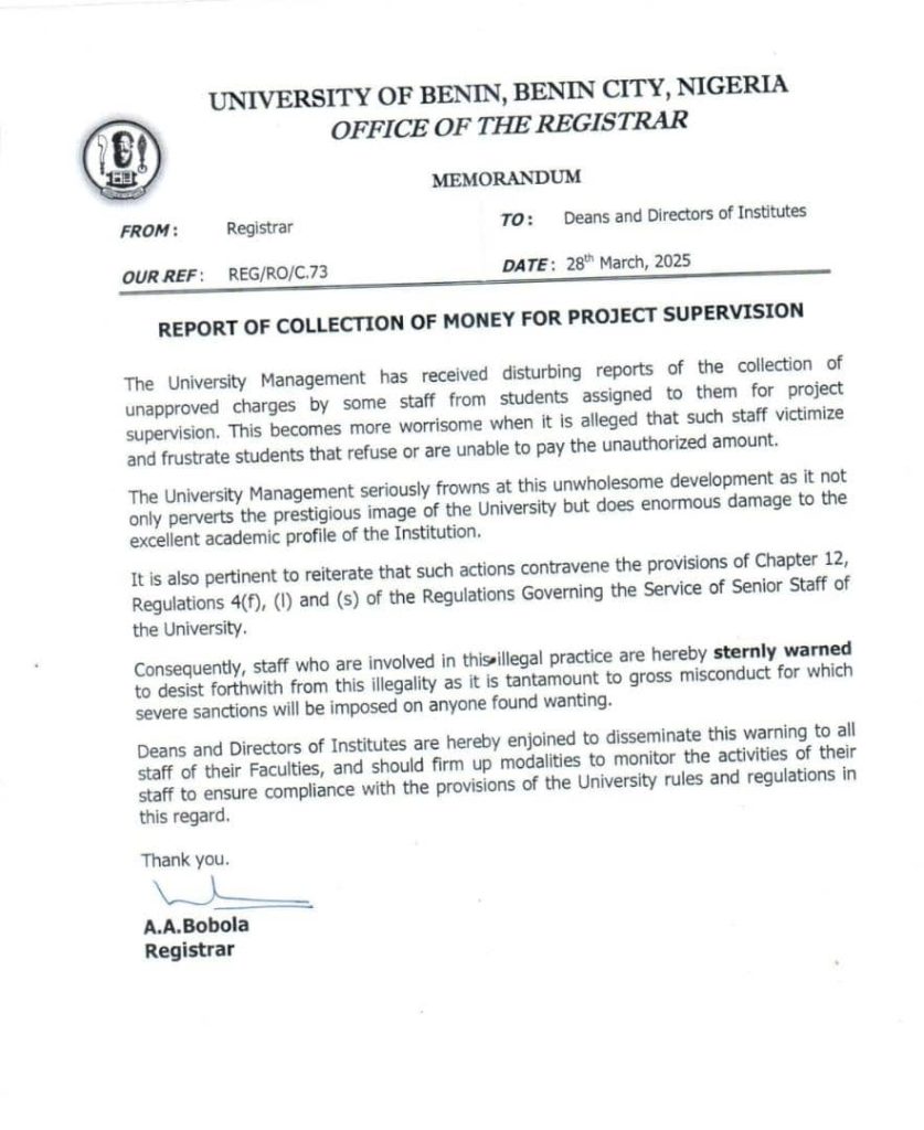 The registrar of the University of Benin sent out a memo to the Deans and Directors of Institutes of various faculties, addressing the underlying reports of unapproved collection of money for project supervision.