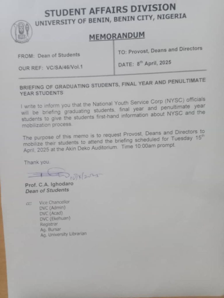On April 8, 2025, the University of Benin announced that officials from the National Youth Service Corps (NYSC) will be holding an important briefing session for graduating, final year, and penultimate year students. The meeting is scheduled to take place on Tuesday, April 15, 2025, at the Akin Deko Auditorium, beginning promptly at 10:00 a.m.