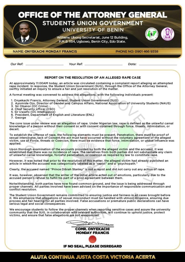 The University of Benin (UNIBEN) Student Union Government (SUG) has cleared Prince Dibiah Stanley of alleged rape charges. This decision follows a thorough investigation conducted by the SUG, through the Office of the Attorney General.