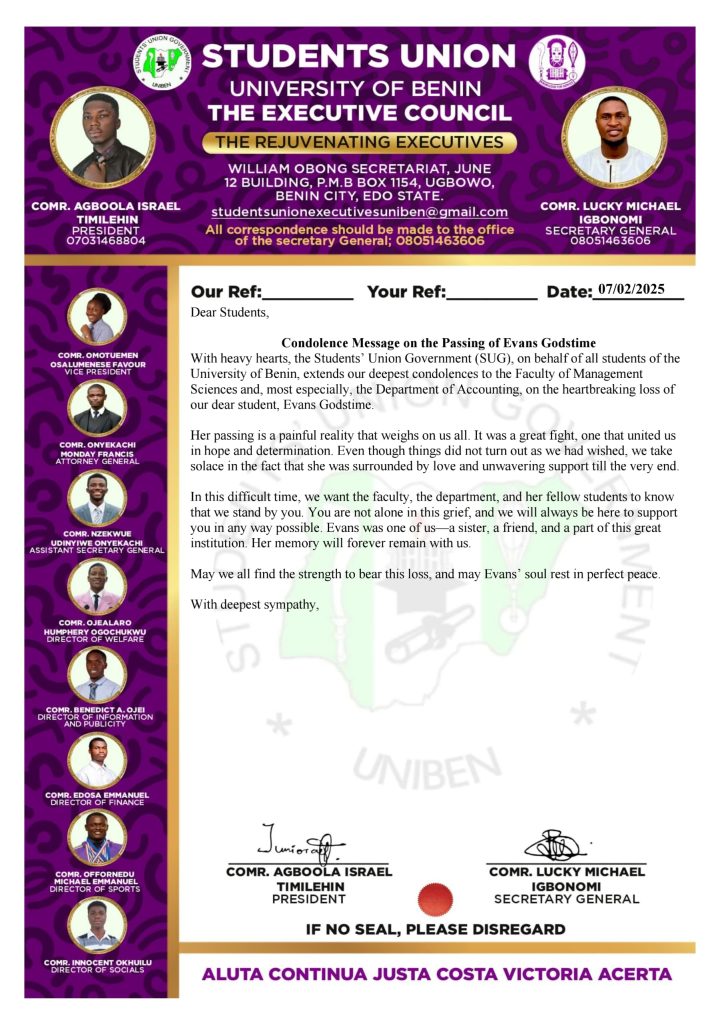 On Friday, 7th February 2025, the Students’ Union Government (SUG) of the University of Benin (UNIBEN) expressed deep sorrow at the passing of Evans Godstime, a student from the Department of Accounting, Faculty of Management Sciences.