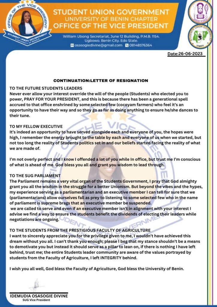 As the University of Benin community continues to grapple with the implications of Divine’s resignation, the hope for positive change and accountable leadership remains strong. The words of her resignation letter have sparked discussions and reflections on the state of student governance at UNIBEN, paving the way for a reevaluation of leadership structures and a renewed commitment to representing the interests of UNIBEN Students.