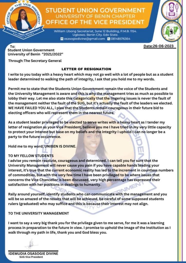 In a surprising turn of events, the Vice President of the Students’ Union Government (SUG) at the University of Benin (UNIBEN), Comrade Idemudia Osasogie Divine has tendered her resignation, citing a failure of the elected leaders and the need for a change in the system. In a heartfelt letter, dated 26th, June 2023, and addressed to the student body and the university management, Comrade Divine expressed her concerns and urged everyone to hold her accountable for her words.